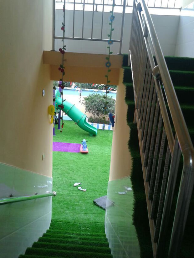 وتغطي السلالم العشب الصناعي في جميع أنحاء الحضانة، يبدو أن السلم الأخضر. الخارج